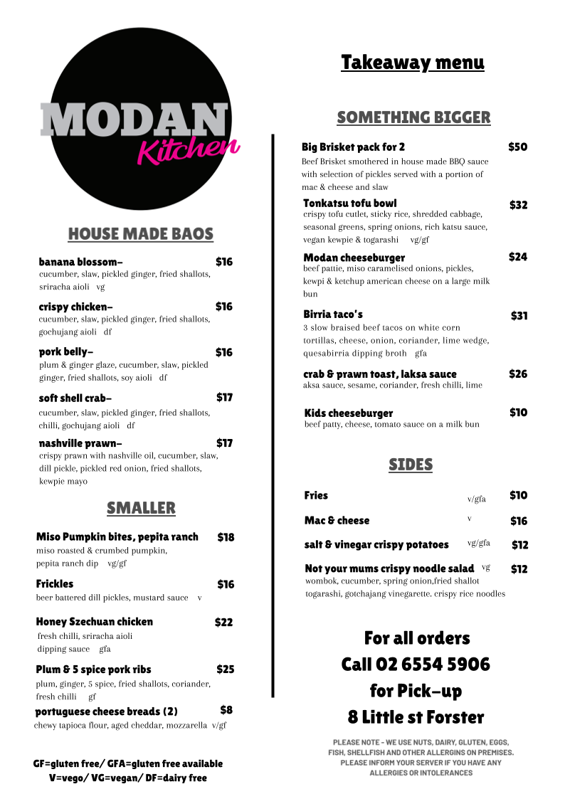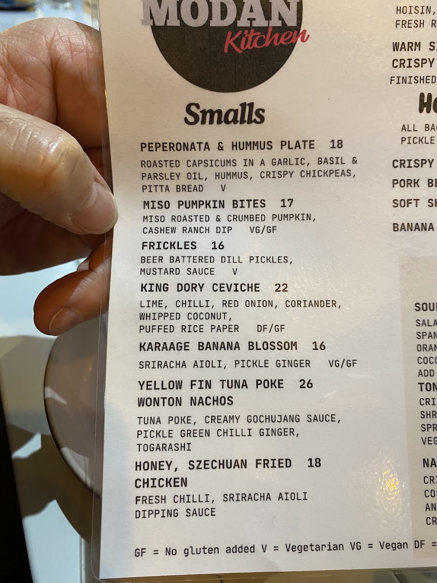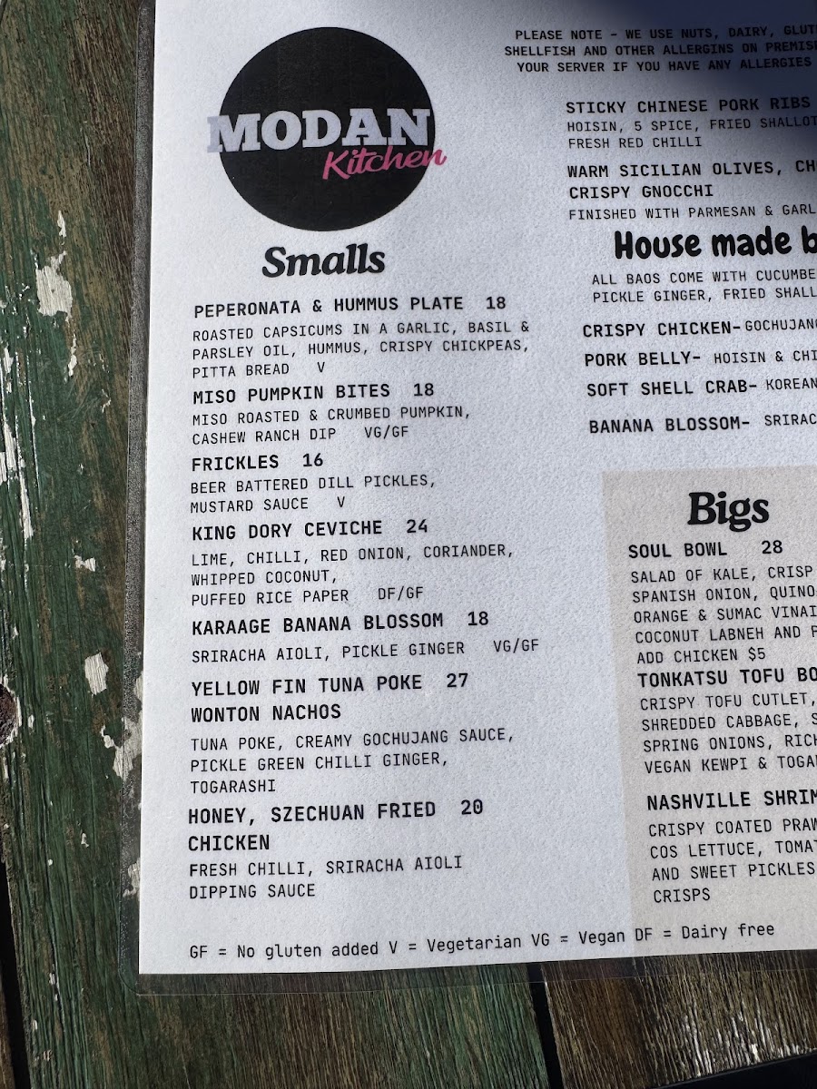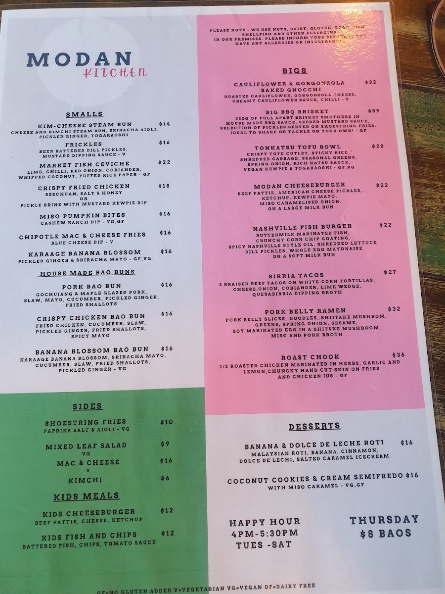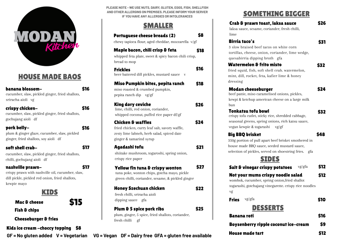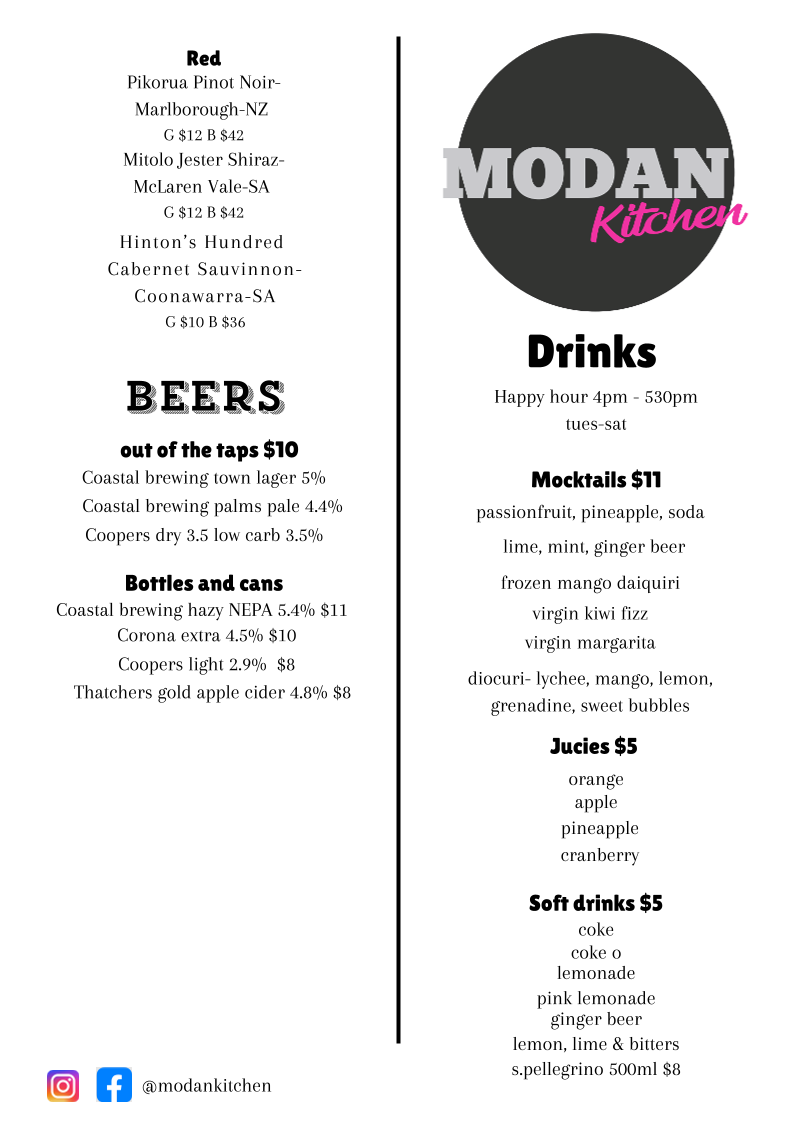 The menu at Modan Kitchen features a variety of food and drink options suitable for casual dining. It is organized into several categories, including Kids Meals, Red Wines, and Bottled and Canned Beverages.