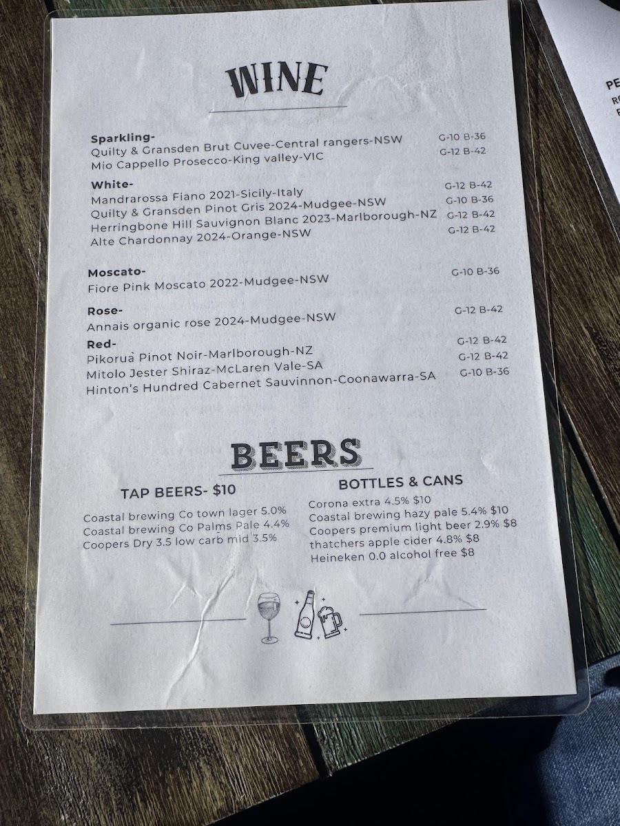 Red Wines include selections like Pikorua Pinot Noir from Marlborough, Mitolo Jester Shiraz from McLaren Vale, and Hinton's Hundred Cabernet Sauvignon from Coonawarra, with prices ranging from A$10.00 to A$12.00 per glass.